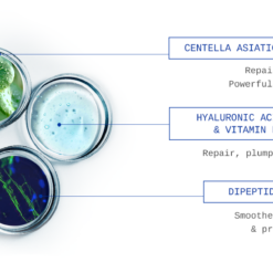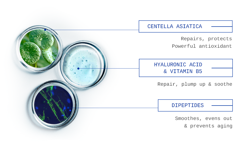 La sinergia de la Centella Asiática reparadora, el Ácido Hialurónico hidratante y redensificante y el Pantenol (o Vitamina B5) calmante y unificador, estimula los mecanismos de reparación de la piel y refuerza sus defensas, haciéndola más resistente a las agresiones diarias.