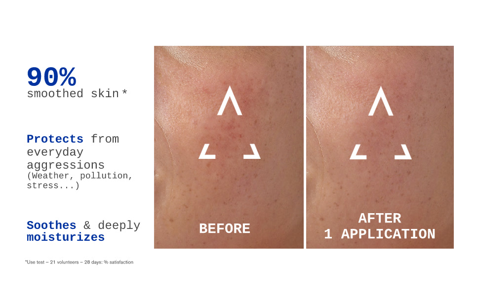 La sinergia de la Centella Asiática reparadora, el Ácido Hialurónico hidratante y redensificante y el Pantenol (o Vitamina B5) calmante y unificador, estimula los mecanismos de reparación de la piel y refuerza sus defensas, haciéndola más resistente a las agresiones diarias.