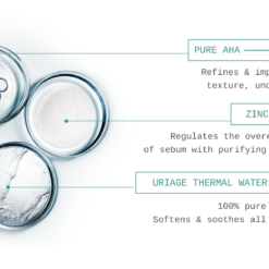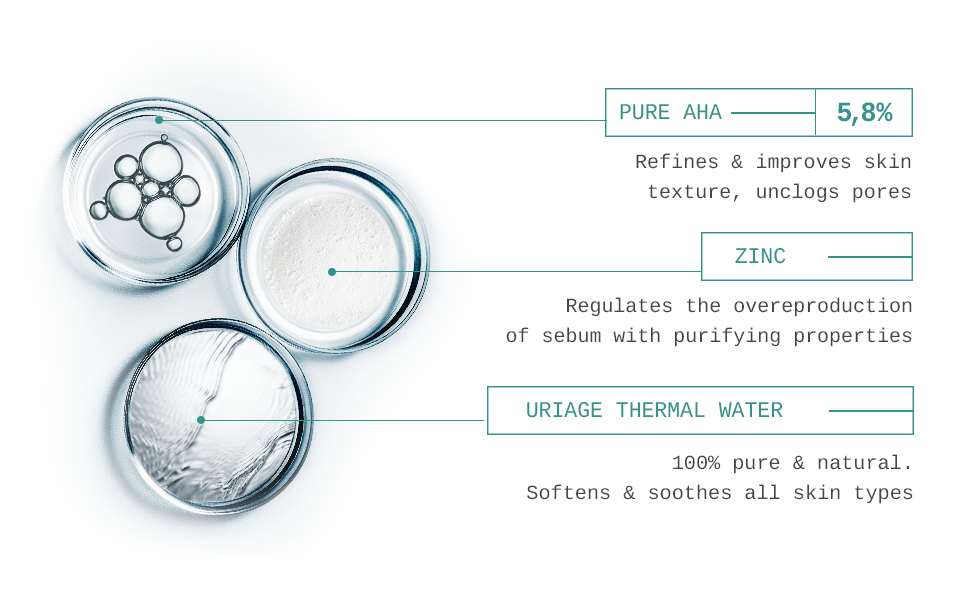 INGREDIENTES ACTIVOS: 5,8% AHA PUROS [ácidos glicólico, málico, láctico] + ZINC + AGUA TERMAL DE URIAGE